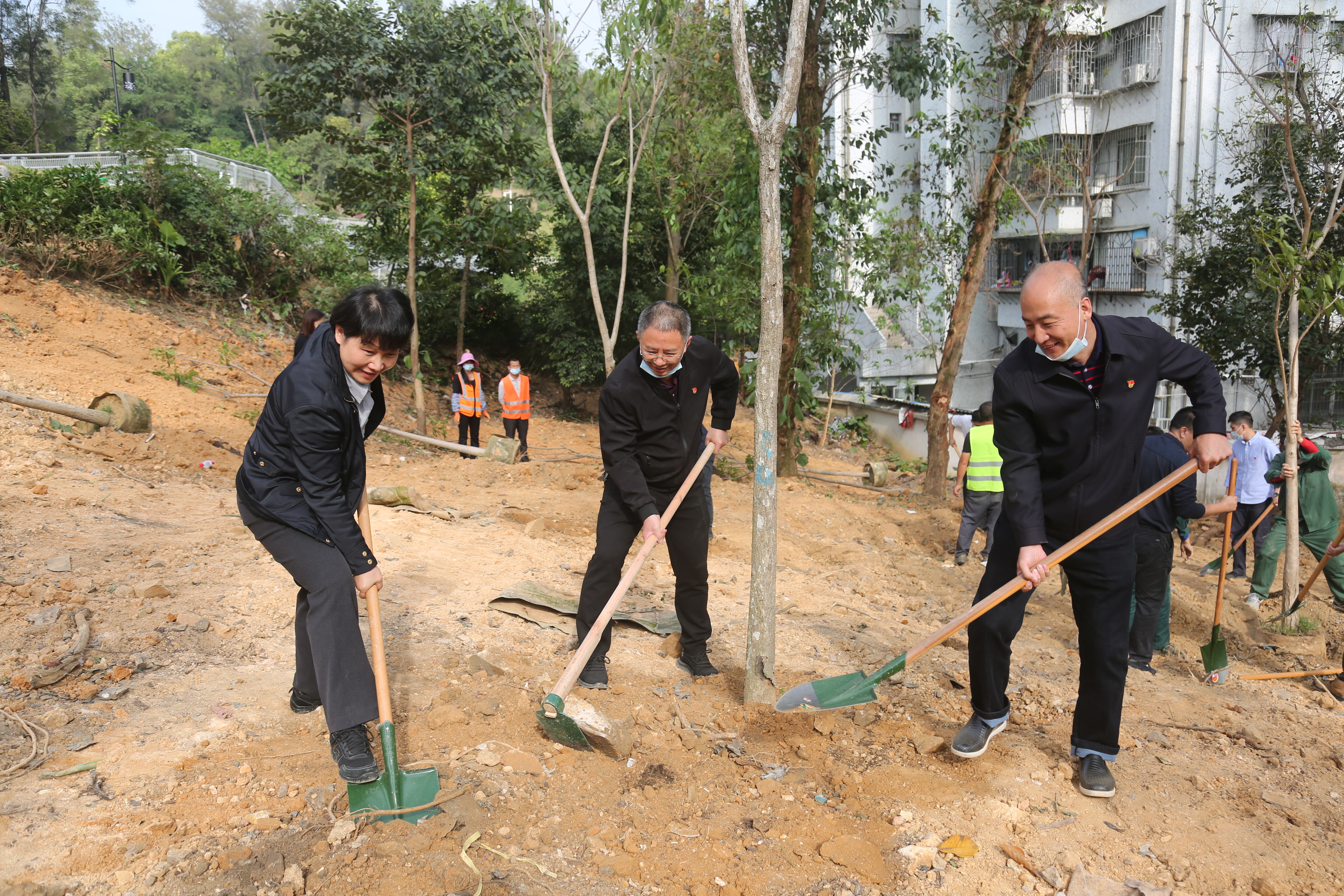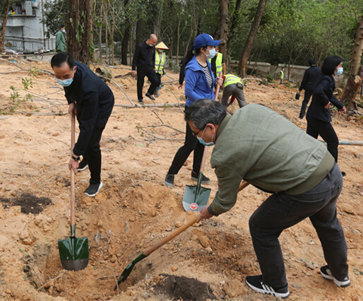 植树现场,大家边挥动锄头卖力种树,边分享党史中关于植树节的故事。经过两个多小时的辛勤劳动,一颗颗富有生机活力的树苗迎风挺立,焕发出勃勃生机,为羊城这块红色土地添上一抹“新绿”的同时,也将百年党史“种”进每位党员干部心中。
