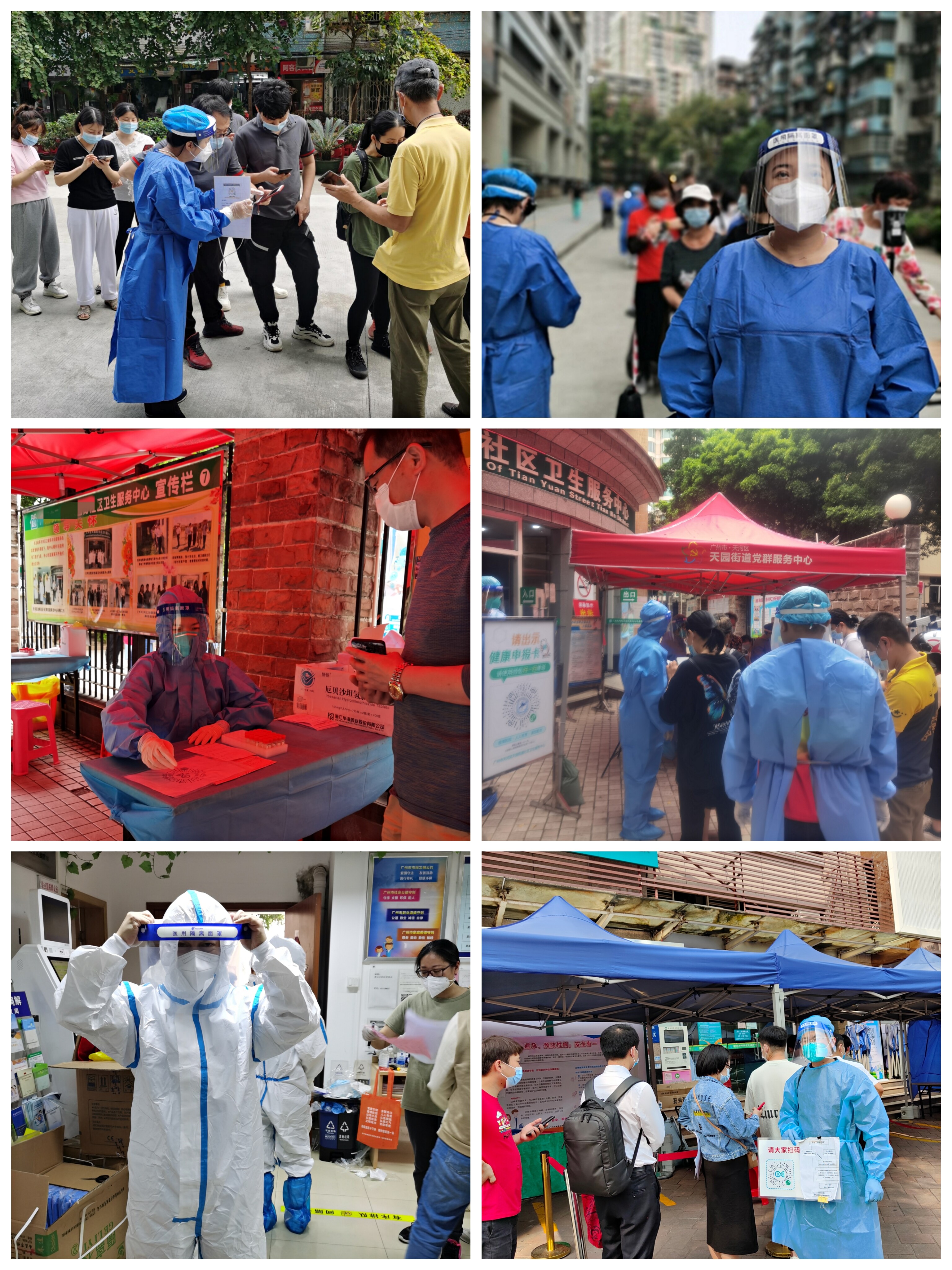 不少志愿者分配到的任务是协助社区卫生服务中心进行核酸检测。他们穿上防护服,戴上隔离帽和手套。由于近日广州气温攀升,到了中午12点,透过防护面罩,可以看到他们的脸上已浸满汗水。