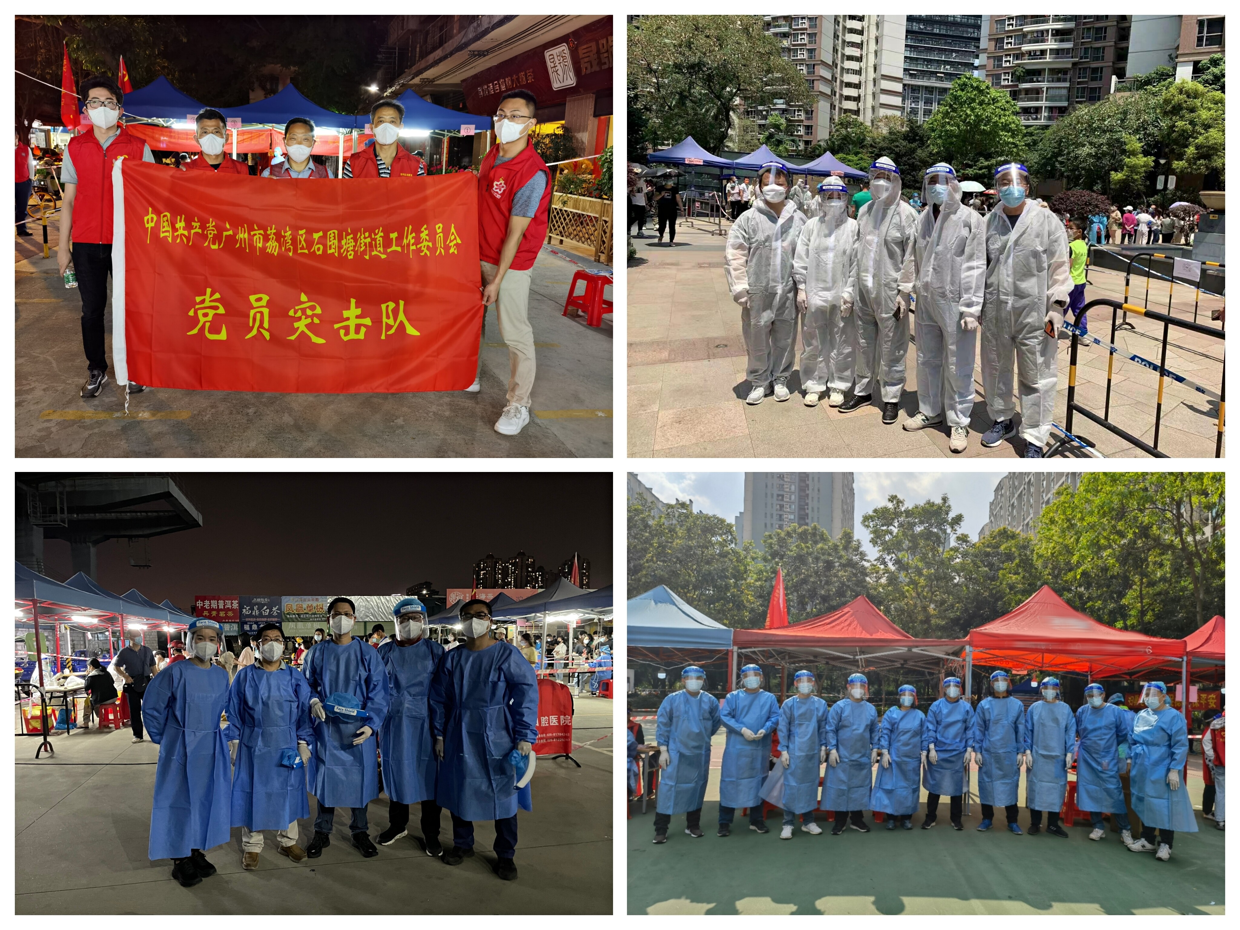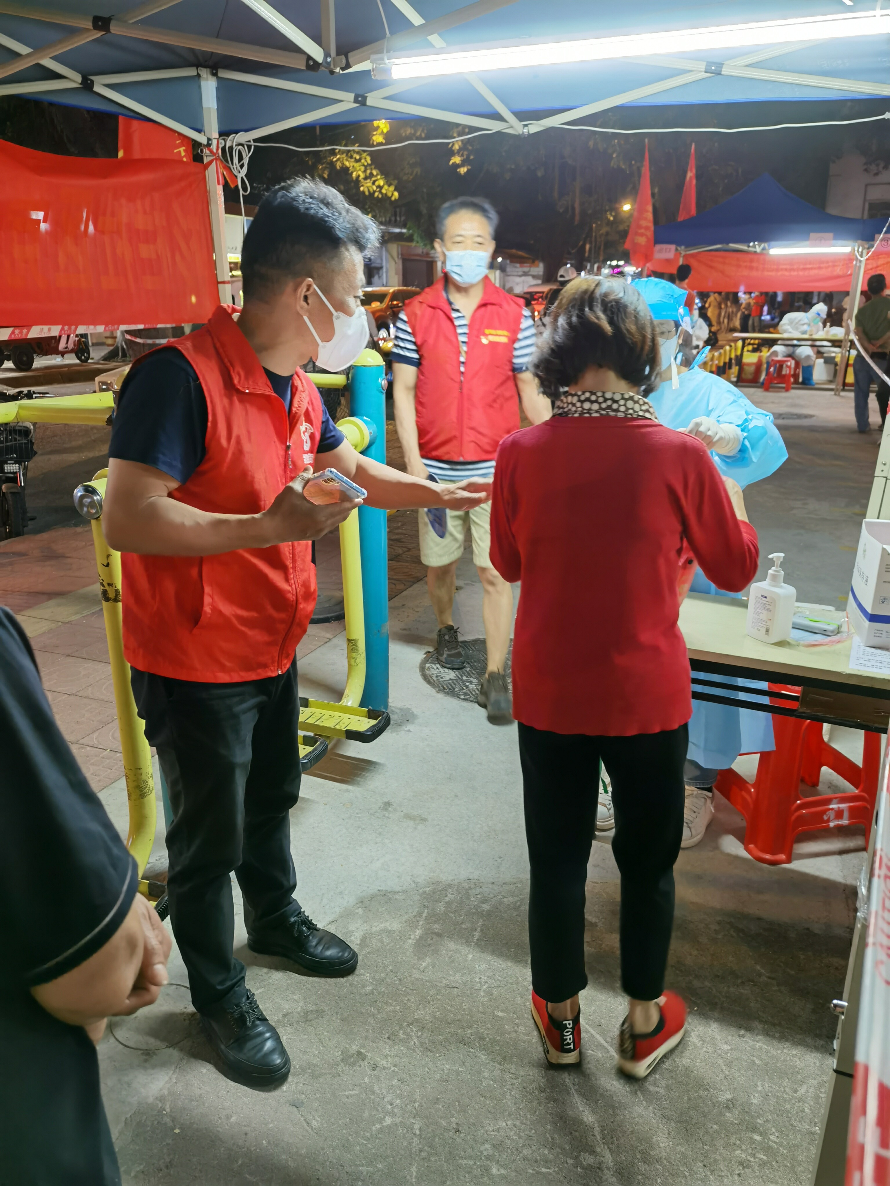 有的同志刚从单位下班到家,便马上穿起红马甲,星夜赶赴一线支援。时至深夜,还有一些街道仍在进行核酸检测。灯火通明,党旗如炽。虽然突击队队员已十分疲惫,仍耐心安抚排队居民,也得到了居民的理解和配合。