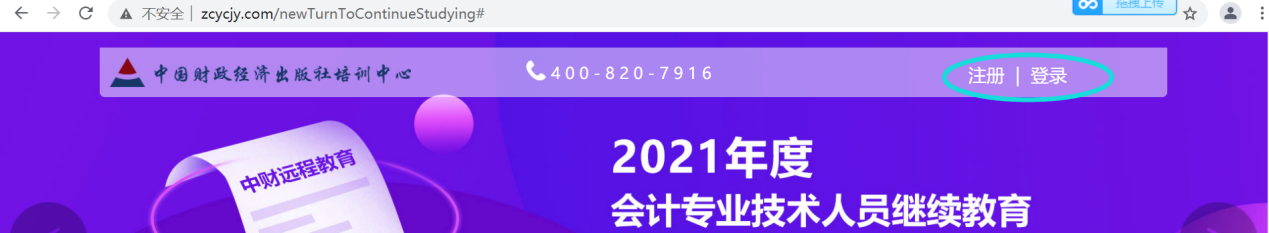 打开网站,中财远程教育网址:www.zcycjy.com,右上角老学员点击登录,新学员先注册后登陆。