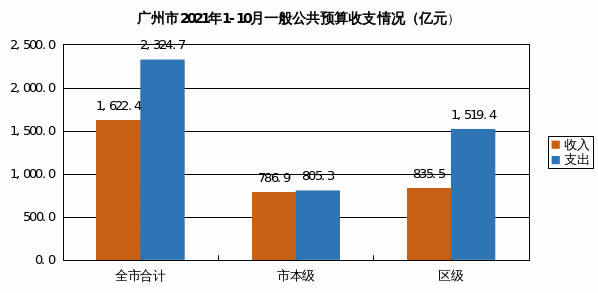 2021年1-10月,全市一般公共预算收入1,622.4亿元,同比增长13.5%。其中:市本级收入786.9亿元,同比增长14.9%;区级收入835.5亿元,同比增长12.3%。全市一般公共预算支出2,324.7亿元,完成年初预算86%,同比下降1%。其中:市本级支出805.3亿元,同比下降1.8%;区级支出1,519.4亿元,同比下降0.6%。