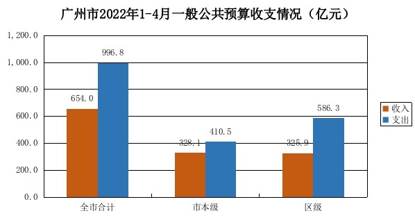 1-4月,全市一般公共预算收入654亿元,完成年初预算33.8%,扣除留抵退税因素增长5.8%,按自然口径计算同比增长1.2%。其中:市本级收入328.1亿元,扣除留抵退税因素增长10.8%,按自然口径计算同比增长8.4%;区级收入325.9亿元,扣除留抵退税因素增长1.4%,按自然口径计算同比下降5.1%。全市一般公共预算支出996.8亿元,完成年初预算34.3%,同比增长4%。其中:市本级支出410.5亿元,同比增长8%;区级支出586.3亿元,同比增长1.3%。
