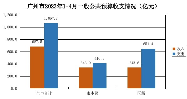 1-4月,全市财政一般公共预算收入687.5亿元,同比增长5.1%。其中:市本级收入343.9亿元,同比增长4.8%;区级收入343.6亿元,同比增长5.4%。