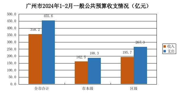 1-2月,全市一般公共预算收入358.2亿元,同比增长2.1%。其中:市本级收入162.5亿元,同比下降4%;区级收入195.7亿元,同比增长7.8%。